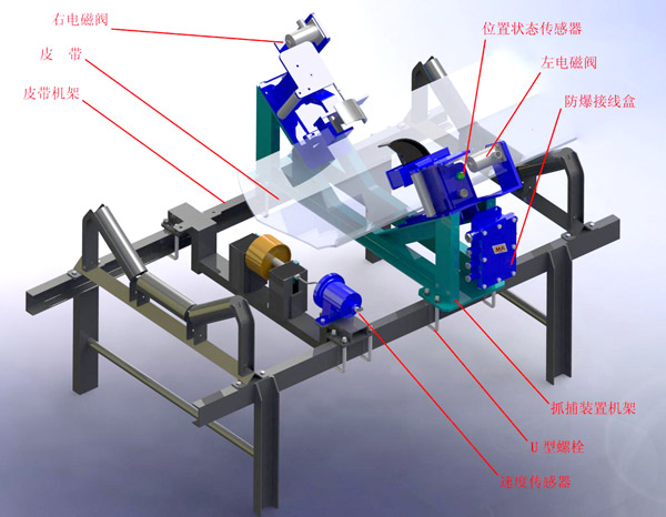 主要特點(diǎn): 該產(chǎn)品為機(jī)電一體化智能型產(chǎn)品,可根據(jù)用戶皮帶機(jī)的實(shí)際運(yùn)行狀況,通過控制主機(jī)(PLC)進(jìn)行編程,滿足用戶要求,在皮帶安全下滑距離內(nèi),不對(duì)皮帶進(jìn)行抓捕。 控制主機(jī)選用西門子可編程控制器(PLC),可實(shí)現(xiàn)與中控室通訊,與礦山智慧物聯(lián)網(wǎng)系統(tǒng)組網(wǎng),實(shí)時(shí)監(jiān)控皮帶機(jī)的工作狀態(tài)。 通過控制程序?qū)崿F(xiàn)自動(dòng)分析皮帶是蠕動(dòng)下滑倒帶還是斷帶的功能;具有故障顯示查詢、聲光報(bào)警功能,可采用多種操作模式。 抓捕皮帶的執(zhí)行機(jī)構(gòu)為一組左、右對(duì)稱的敞開式凸輪壓帶方式,體積小,結(jié)構(gòu)緊湊。抓捕皮帶的夾緊力隨著皮帶下滑位移的增大而增加。 該執(zhí)行機(jī)構(gòu)的凸輪壓帶部分為高分子復(fù)合材料一次注塑成形,具有強(qiáng)度大、韌性好、重量輕等特點(diǎn),能保證在抓捕皮帶時(shí)與皮帶緊密接觸,防止打滑,不損傷皮帶。 采用沿線多點(diǎn)布置,當(dāng)速度傳感器檢測(cè)到皮帶運(yùn)行異常(斷帶、倒帶)時(shí),沿途布置的所有斷帶抓捕裝置同時(shí)動(dòng)作,抓捕指令準(zhǔn)確無誤,抓捕動(dòng)作一致,可靠。 該產(chǎn)品具有人工試驗(yàn)功能,可隨時(shí)在現(xiàn)場(chǎng)進(jìn)行抓捕動(dòng)作試驗(yàn)。 獨(dú)有的位置狀態(tài)傳感器可實(shí)時(shí)檢測(cè)斷帶抓捕裝置的工作狀態(tài)。